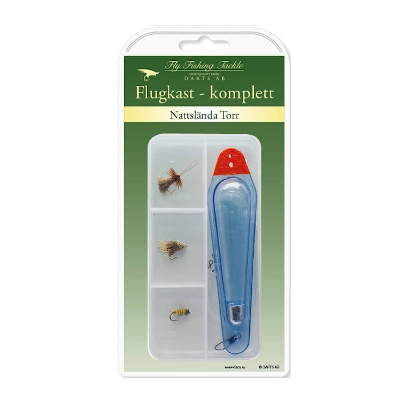 Komplett flugkast med flöte, tafs och tre moderna flugor i praktisk ask.