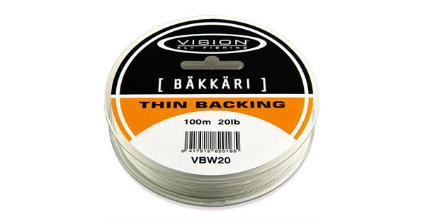 Vision Bäkkäri är en vit tunn och stark backing som inte färgar av sig på linan. Fast backingen är tunn och stark så skär den inte ner i rullen när den belastas hårt.