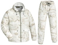 Lätt och luftig kamouflagedräkt. Jackan har stora framfickor med tryckknappar, byxan har två fickor med dragkedja samt elastisk midja med dragsko. Resår i ben och ärmslut. Fast, reglerbar huva. Behandlad med Bionic Finish® Eco för extra vattenavvisande egenskaper. Reglerbar fast kapuschong. 100% polyester.
