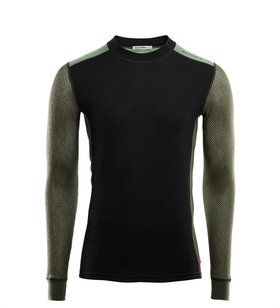 WoolNet Hybrid Crew Neck är en underställs tröja från Aclima som är gjord utav en kombination av stickat nättyg (armar och rygg) och extra täckande material vid extra utsatta områden, som framsidan av kroppen.