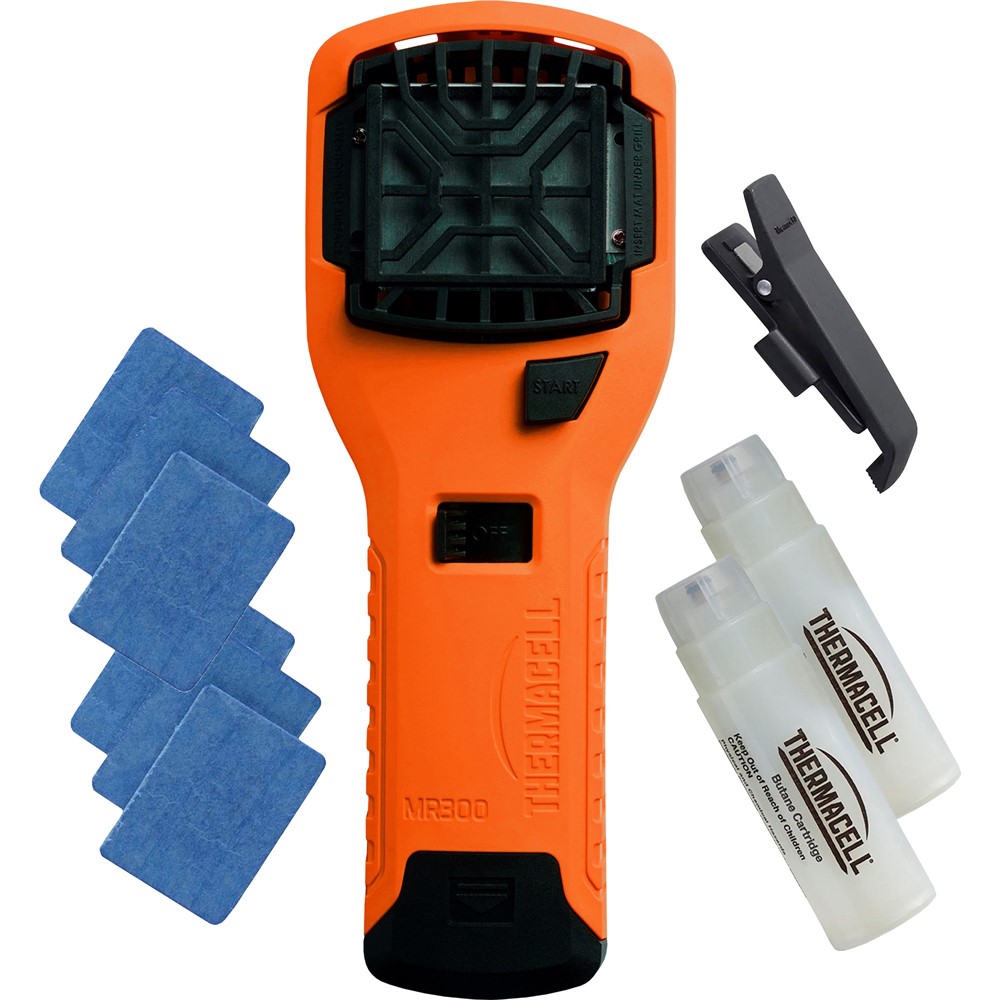 Thermacell MR300 är ett effektivt skydd mot mygg och knott som är enkel att ta med sig. MR300 passar ypperligt både att ha på bordet framför dig och att lägga på marken vid exempelvis tältningen eller picknicken. MR300 utsöndrar ett luktfritt myggmedel som skapar en skyddszon på ca 20 m² (98 % skydd). Det finns ett hölster som tillbehör som gör att du enkelt kan fästa den på exempelvis ryggsäcken, bältet el liknande. Apparaten levereras med 12 timmars myggskydd. MR300 är en uppgraderad version som är enkel att hantera och dessutom har en tystare igångsättning och går att slå av och på med bara en hand. Thermacell fungerar även bra för att hålla bromsarna på avstånd.