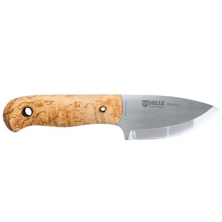 Jaktkniven Helle 620 Mandra är 149 mm lång och har ett trippel laminerat knivstål med skaft av masurbjörk och vulkanfiber samt en läderslida.