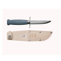 Med ett spolformat betsat eller oljat skaft av FSC® certifierat skandinaviskt björkträ, dubbel parerstång och ett 2,0 mm tjockt, spetslöst blad av återvunnet svenskt rostfritt stål är kniven alltid redo för nästa uppgift. Tack vare en mindre skaftgeometri vilar kniven komfortabelt i en liten hand. Knivens fulla sticktånge löper genom hela skaftet och ger både styrka och stabilitet i varje skär. Knivslidan i sin naturliga färg av vegetabiliskt garvat läder har en bältesstropp som enkelt kan fästas på bältet och för säkerhets skull är den utrustad med ett enkelt och klassiskt knapplås som säkrar kniven i knivslidan. Det präglade Dalavapnet på knivslidan är en väl bevarad detalj från svunna tider. Knivslidan bör alltid vara monterad på kniven när den inte används för att omsorgsfullt skydda såväl användaren som den vassa eggen. Vid kontakt med andra ytor än trä kan eggen bli slö. Barns knivhantering bör alltid ske i vuxet sällskap. De karaktäristiska Scoutknivarna har ända sedan de först introducerades på 1930-talet varit en självklar instegskniv för barn och en dörröppnare för ett rikare friluftsliv.