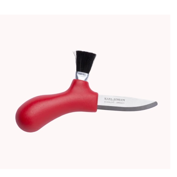 Det ergonomiska skaftet av polymer och det 1,4 mm tjocka, spetslösa bladet av återvunnet svenskt rostfritt stål är speciellt utvecklat för att enkelt kunna skära och rensa svamp. Borsten är tillverkad av äkta hästtagel och knivslidan av polymer är enkel att rengöra.