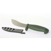 Kniv med gummihandtag och plastslida som är lätt att hålla ren.