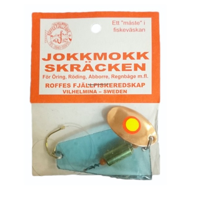 Roffes Jokkmokkskräcken är ett riktigt unikt blänke. det består av plexiglasskiva, liten kopparsked med fluotejp och sedan en mässingkropp som tyngd. Blänket får en mycket unik rörelse i vattnet som attraherar fisken. Blänkets totala längd är ca. 100 mm.